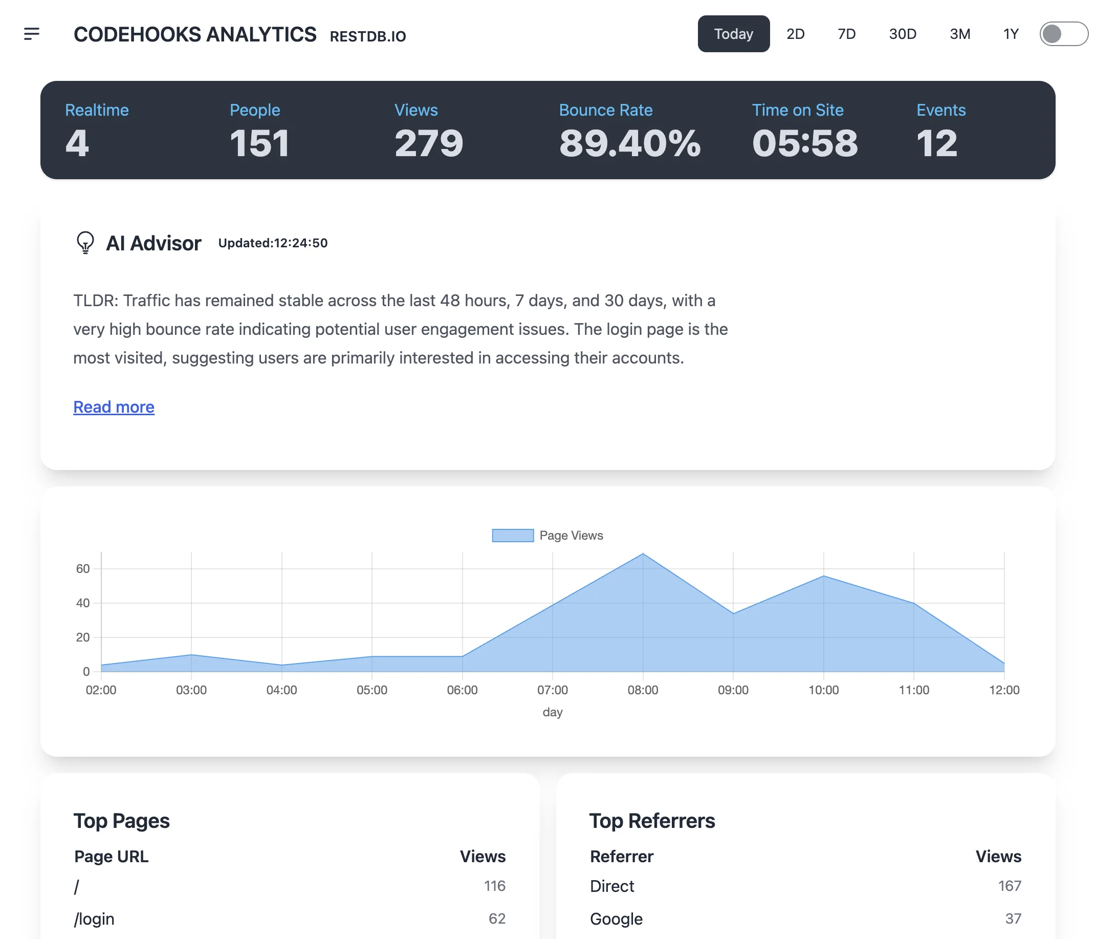 Codehooks Analytics is an open-source web analytics tool for tracking website and app traffic, giving you full control over your data and dashboard. You can deploy it as-is, customize it, or build your own solution.